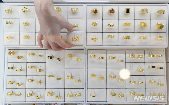 [서울=뉴시스] 고승민 기자 = 달러화 강세에 국제 금값이 4개월 연속 하락세를 보이고 있는 것으로 알려진 26일 서울 종로구 한국금거래소에서 직원이 금 제품을 들어 보이고 있다. 최근 금값은 인플레이션 상황에도 지속적인 하락세를 보이고 있다. 이는 지난 2020년 11월 이후 가장 긴 하락세다. 2022.07.26. [email protected]