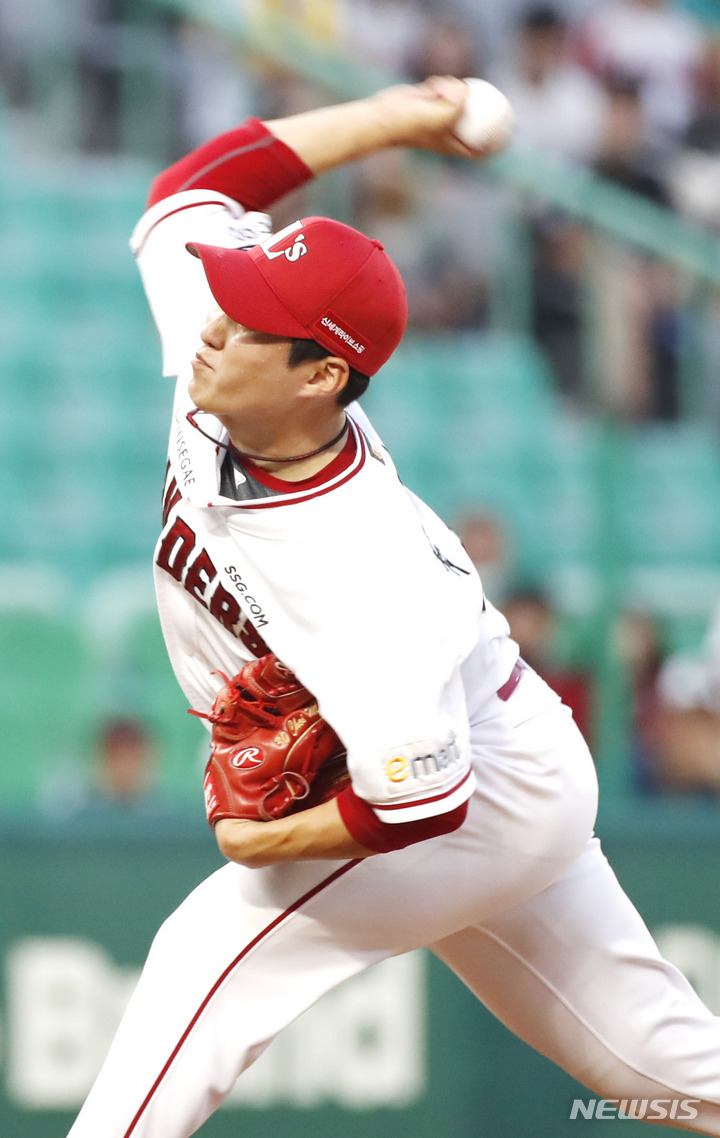 [인천=뉴시스] 정병혁 기자 = 26일 오후 인천 미추홀구 SSG랜더스필드에서 열린 2022 신한은행 SOL 프로야구 SSG랜더스와 LG트윈스의 경기, 4회초 SSG 최민준이 역투하고 있다. 2022.07.26. [email protected]