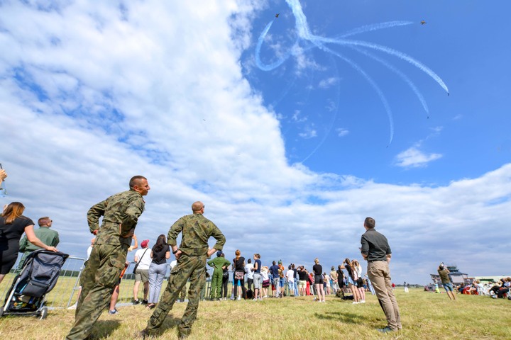 [서울=뉴시스] 27일(현지시간) 폴란드 뎅블린 공군 기지에서 열린 열린 대한민국 공군 블랙이글스 에어쇼에서 관람객들이 곡예비행을 관람하고 있다. (사진=공군 제공) 2022.07.28. [email protected] *재판매 및 DB 금지