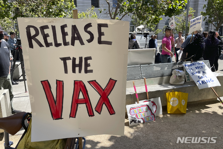 [샌프란시스코=AP/뉴시스] 런던 브리드 샌프란시스코 시장은 28일(현지시간) 원숭이두창의 확산에 대비하기 위해 비상사태를 선포했다. 시는 80년대 후천성 면역 결핍증(AIDS)의 여파로 도시 전체가 피폐해졌던 과거를 되풀이하지 않겠다고 밝혔으나 원숭이두창 확진자가 260명을 넘어 캘리포니아주 감염자의 30%를 차지하면서 백신 부족 사태를 겪고 있다. 사진은 지난 18일 시위대가 원숭이두창 백신을 요구하는 모습. 2022.07.29.