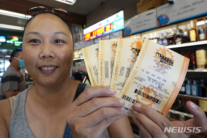 [새크라멘토=AP/뉴시스] 29일(현지시간) 미 캘리포니아주 새크라멘토의 한 마트에서 메가밀리언 복권을 산 여성이 복권을 보여주고 있다. 금요일 추첨하는 메가밀리언 복권의 1등 당첨금은 12억8천만 달러(약 1조7천억 원)에서 계속 올라가고 있다. 2022.07.30.
