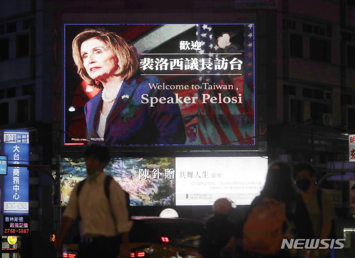 [타이베이=AP/뉴시스] 2일(현지시간) 대만 타이베이 거리에서 시민들이 낸시 펠로시 미국 하원의장을 환영하는 전광판 앞을 걷고 있다. 펠로시 의장은 3일 차이잉원 대만 총통을 만날 것으로 알려졌다. 2022.08.03.