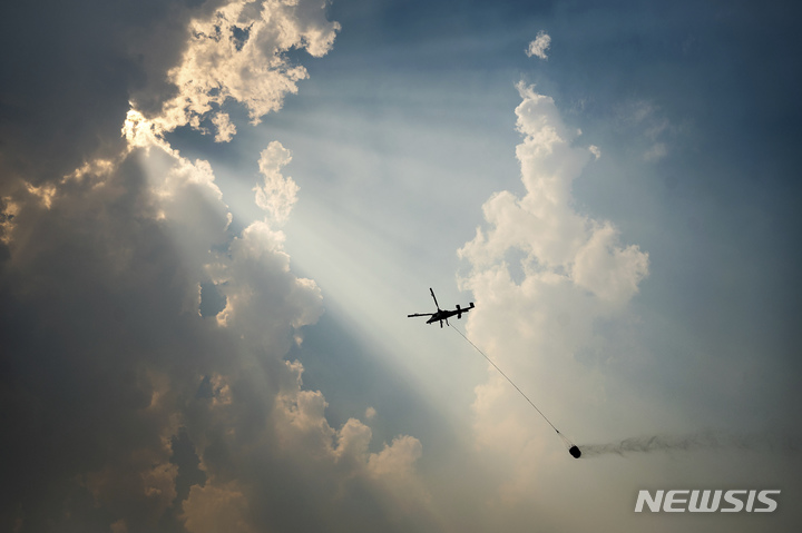 [시스키유 카운티=AP/뉴시스] 2일(현지시간) 미 캘리포니아주 시스키유 카운티의 클래머스 국립수목원 '맥키니 산불' 현장 상공에서 소방 헬기 한 대가 물을 나르고 있다. 2022.08.03.