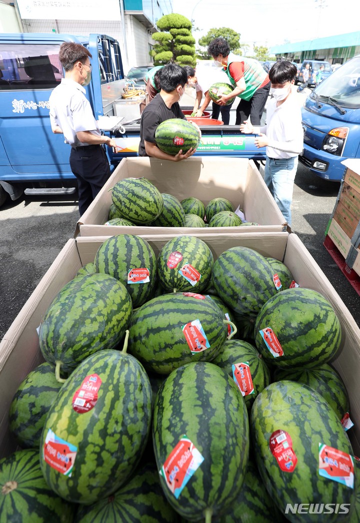 [부산=뉴시스] 하경민 기자 = 부산 사상구 엄궁농산물도매시장 관리사업소 관계자 등이 3일 지역 경로당과 복지시설에 전달할 수박을 차량에 싣고 있다. 이 시장의 종사자들이 기부한 수박 700통은 이날 사상구·사하구 경로당 344곳과 아동센터연합회 21곳, 서구 마리아수녀회 등에 전달된다. 2022.08.03. [email protected]