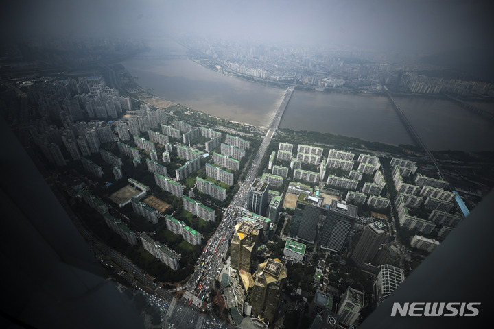 [서울=뉴시스] 정병혁 기자 = 올해 상반기 서울에서 거래된 주택 10채 중 7채는 소형 면적인 것으로 나타났다. 부동산 정보제공 업체 경제만랩이 한국부동산원 자료를 분석한 결과, 올해 상반기(1월~6월) 서울 주택 매매거래량은 3만4945건으로 나타났다. 이 중 전용면적 60㎡ 이하의 주택 매매거래량은 2만4673건으로 전체 거래량의 70.6%에 달하는 것으로 나타났다. 이는 부동산원이 관련 통계를 작성하기 시작한 2006년 이래 상반기 기준으로 가장 높은 비중이다. 사진은 3일 오후 서울 송파구 롯데월드타워 전망대 서울스카이에서 바라본 서울시내 아파트의 모습. 2022.08.03. [email protected]