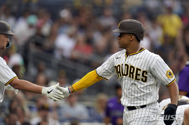 [샌디에이고=AP/뉴시스] 샌디에이고 파드리스의 후안 소토(오른쪽)가 3일(현지시간) 미 캘리포니아주 샌디에이고의 펫코 파크에서 열린 2022 메이저리그 콜로라도 로키스와의 경기 1회 말 볼넷으로 걸어 나간 후 만루 상황에서 후속 타자 사사구로 득점하고 있다. 샌디에이고는 워싱턴 내셔널스와 트레이드를 단행해 후안 소토와 조시 벨을 영입했다. 2022.08.04.