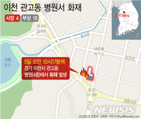 [서울=뉴시스] 5일 오전 10시17분께 경기 이천시 관고동의 한 병원에서 발생한 불이 나 4명이 숨지고 18명이 부상하는 사고가 발생했다. 불이 시작된 곳은 건물 4층에 있는 투석전문 병원으로, 내부에 환자가 다수 있던 것으로 알려졌다. (그래픽=전진우 기자)