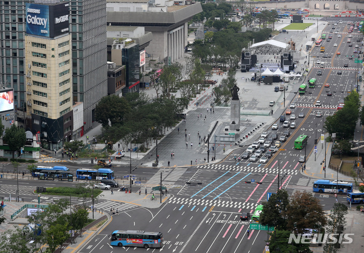 [서울=뉴시스] 이영환 기자 = 6일 오전 서울 종로구 광화문광장에서 시민들이 이동하고 있다. 광화문광장은 착공 1년9개월만에 공사를 마치고 이날 재개장했다. 2022.08.06. [email protected]