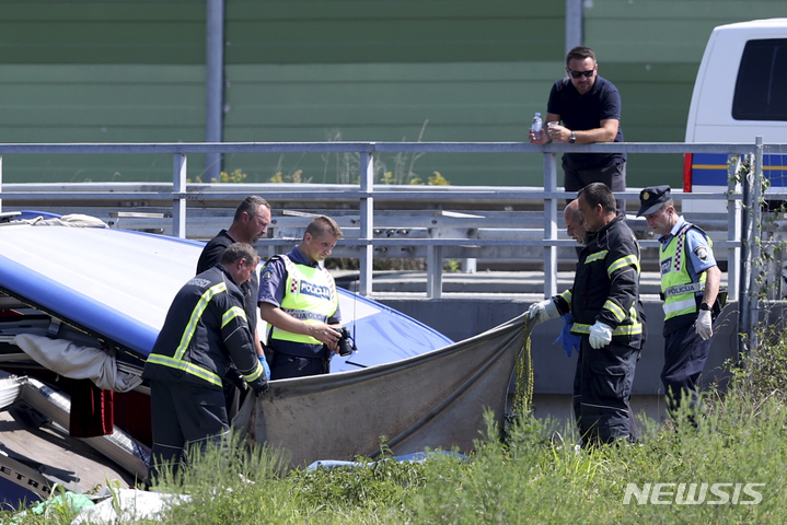 [자그레브=AP/뉴시스] 6일(현지시간) 크로아티아 자그레브 인근 포드보렉에서 구조대원들이 버스 추락 사고 사망자들의 시신을 옮기고 있다. 이날 사고로 최소 12명이 사망하고 30여 명이 부상했다. 2022.08.07