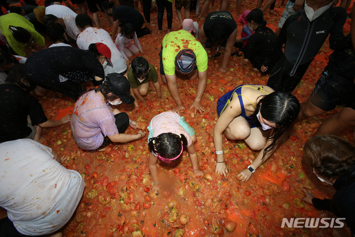 [화천=뉴시스] 김경목 기자 = 2022 화천토마토축제 마지막 날인 7일 오전 축제 참여자들이 강원 화천군 사내면 사창리 문화마을 축제장에서 열린 '황금반지를 찾아라!' 이벤트에서 토마토 속에 숨겨진 검은반지를 찾는 재미에 푹 빠져 있다. 검은반지를 찾으면 진짜 1돈짜리 황금반지를 받는다. 2022.08.07. [email protected]