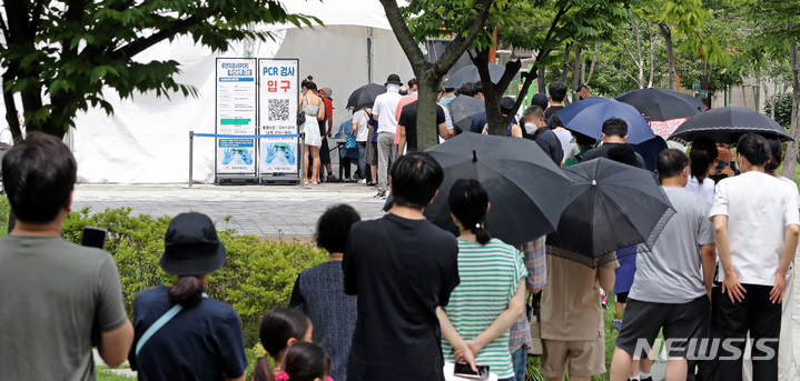 [서울=뉴시스] 김금보 기자 = 7일 오후 서울 구로구 오류동역 광장 임시선별진료소에서 시민들이 코로나19 검사를 받기 위해 순서를 기다리고 있다. 이날 0시 기준 코로나19 신규 확진자는 10만 5507명으로 집계됐다. 2022.08.07. [email protected]