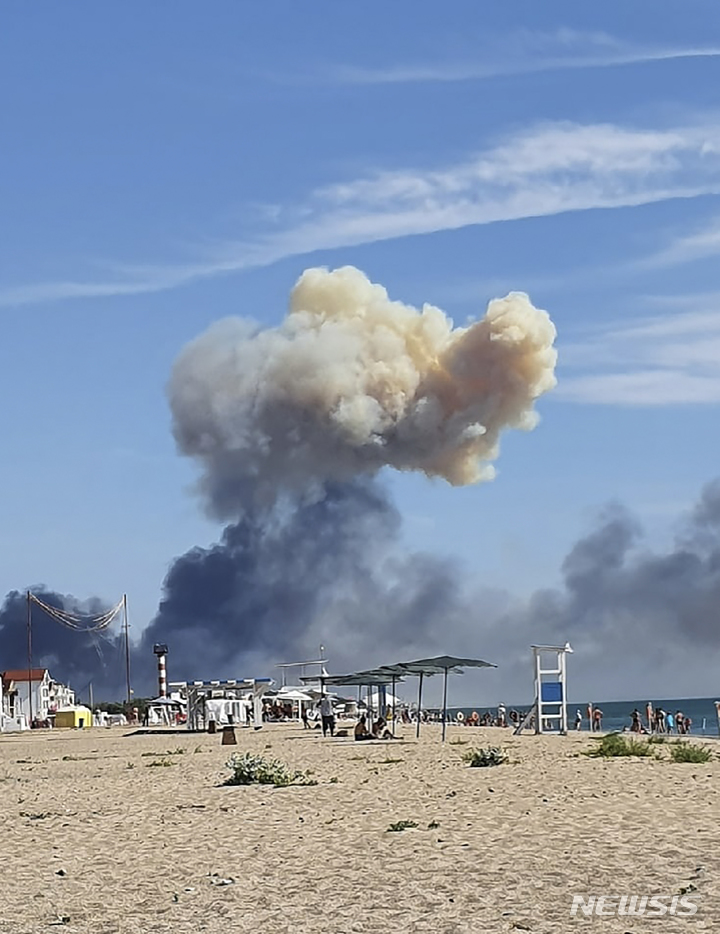 [노보페도리브카=AP/뉴시스] 9일(현지시간) 러시아 합병지역인 우크라이나 남부 크림반도의 노보페도리브카에 있는 사키 공군 기지 방향에서 폭발음이 들린 뒤 연기가 치솟고 있다. 이곳에서 최소 12차례의 폭발이 있었으며 피해가 없다는 러시아 측의 발표와는 달리 1명이 숨지고 8명이 다친 것으로 알려졌다. 2022.08.10.