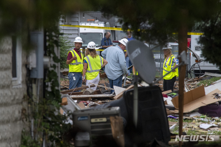 [에번스빌=AP/뉴시스] 10일(현지시간) 미 인디애나주 에번스빌에서 구조대가 주택 폭발 현장을 살피고 있다. 현지 소방국장은 에번스빌에서 발생한 폭발로 최소 3명이 숨지고 39채의 가옥이 파손됐다고 밝혔다. 2022.08.11.