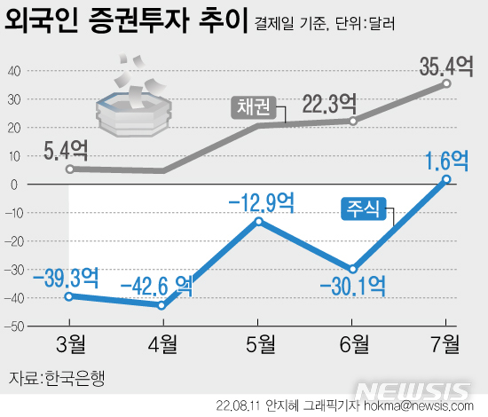 [서울=뉴시스] 11일 한국은행에 따르면 지난달 외국인의 국내 주식 투자자금이 1억6000만 달러 유입되면서 6개월 만에 순유입 전환했다. 7월 말 원·달러 환율(1299.1원)로 계산하면 약 2070억원이다. 외국인 채권자금은 공공자금 유입 전환으로 35억4000만 달러 순유입 되는 등 전달(22억3000만 달러) 대비 순유입 규모가 큰 폭 확대 됐다. (그래픽=안지혜 기자)