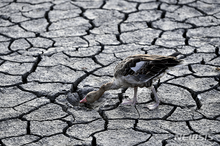 [벨렌체=AP/뉴시스] 11일(현지시간) 헝가리 벨렌체의 말라붙은 벨렌체 호수에서 거위 한 마리가 갈라진 바닥을 뒤지며 물을 찾고 있다. 전례 없는 가뭄이 유럽 대륙 절반을 뒤덮어 다뉴브강, 라인강, 포강 등 유럽 주요 강의 수위가 급격히 떨어져 농장 경제에 피해를 주고, 물 제한을 강요하며 수생종을 위협하는 것으로 알려졌다. 2022.08.12.