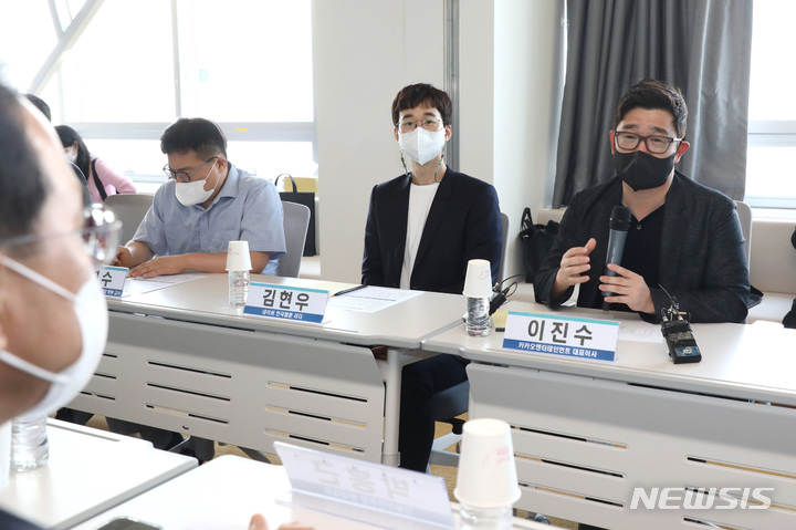 [서울=뉴시스] 국회사진기자단 = 이진수 카카오엔터 대표이사가 12일 오전 서울 마포구 카카오엔터테인먼트 합정오피스에서 열린 더불어민주당 민생우선실천단 빅테크 갑질대책 TF '웹툰 정산정보제공 시연 및 플랫폼·창작자 상생간담회'에서 인사말을 하고 있다. 2022.08.12. [email protected]