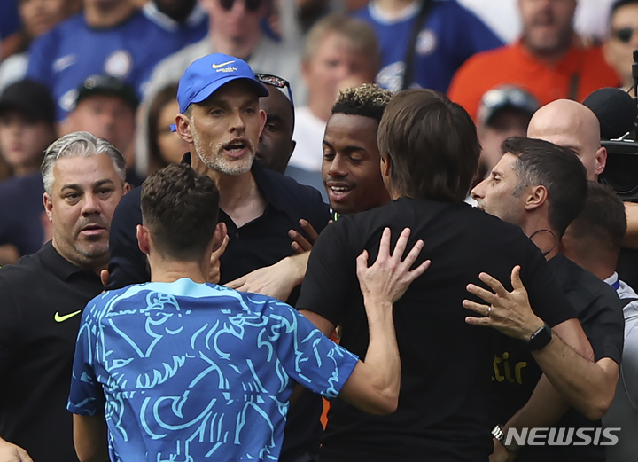 [런던=AP/뉴시스] 토마수 투헬(파란 모자) 첼시 감독과 안토니오 콘테 토트넘 홋스퍼 감독이 14일(현지시간) 영국 런던의 스탬퍼드 브리지에서 열린 2022-23 잉글랜드 프리미어리그(EPL) 2라운드 경기 중 충돌하고 있다. 손흥민은 침묵했고 토트넘은 해리 케인의 후반 추가시간 동점 골로 간신히 2-2로 비겼다. 2022.08.15.