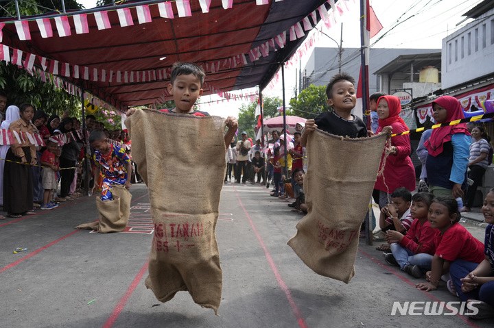 [자카르타=AP/뉴시스] 제77주년 인도네시아 독립기념일인 17일(현지시간) 자카르타에서 열린 기념행사 중 '자루 경주'에 참가한 어린이들이 자루에 들어가 뛰고 있다. 인도네시아는 1945년 8월 17일 네덜란드로부터 독립했다. 2022.08.17.