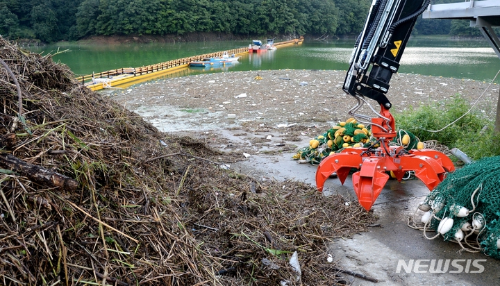 [옥천=뉴시스] 조성현 기자 = 17일 오후 충북 옥천군 군북면 추소리의 대청호가 집중호우 때 떠밀려온 각종 쓰레기와 녹조로 뒤덮여 있다. 2022.08.17. [email protected]