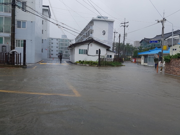 [양양=뉴시스] 김경목 기자 = 17일 오후 강원 양양군의 한 마을 아파트 일대가 동풍의 영향으로 내리고 있는 많은 비에 침수되고 있다. (사진=양양군청 제공) 2022.08.17. [email protected]