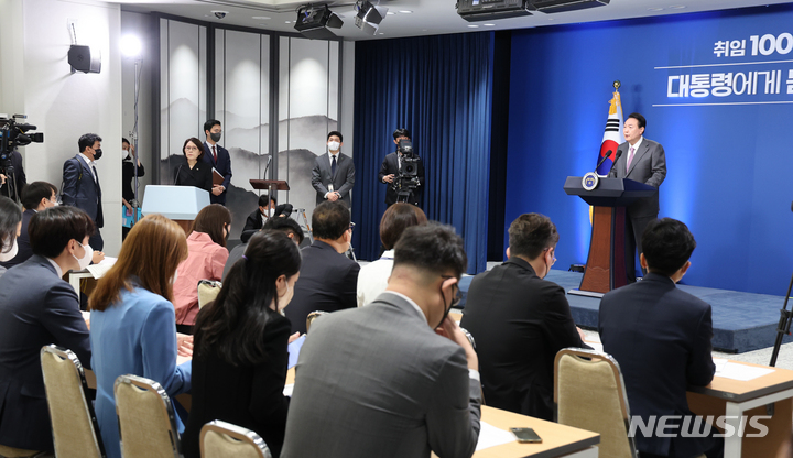 [서울=뉴시스] 홍효식 기자 = 윤석열 대통령이 17일 서울 용산 대통령실 브리핑룸에서 열린 취임 100일 기자회견을 하고 있다. (대통령실통신사진기자단) 2022.08.17. [email protected]