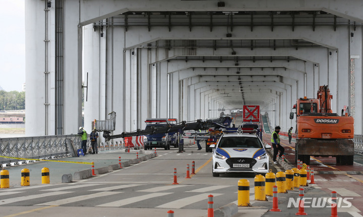 [서울=뉴시스] 조수정 기자 = 17일 오후 집중호우 이후 교통이 전면통제되고 있는 잠수교에서 시 관계자들이 통행 재개를 앞두고 휘어진 펜스 등 침수 피해 복구작업을 하고 있다. 2022.08.17. [email protected]