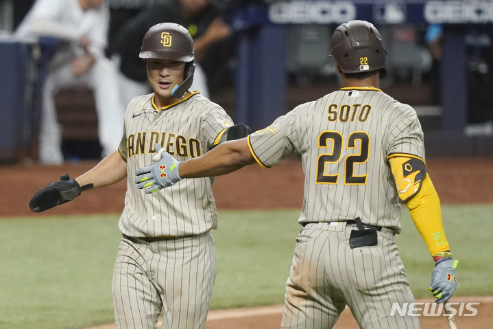 [마이애미=AP/뉴시스] 샌디에이고 파드리스의 김하성(왼쪽)이 17일(현지시간) 미 플로리다주 마이애미의 론디포 파크에서 열린 2022 메이저리그 마이애미 말린스와의 경기 8회 초 볼넷으로 걸어 나가 3루까지 진루해 상대 투수 폭투 때 홈인하고 있다. 김하성은 4타수 3안타 4타점 1득점의 활약을 펼치며 팀의 10-3 승리에 이바지했다. 2022.08.18.