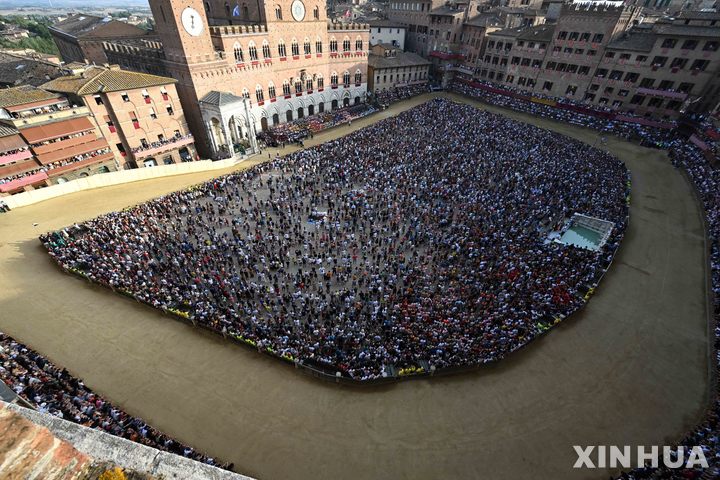 [시에나=신화/뉴시스] 17일(현지시간) 이탈리아 시에나의 캄포 광장에 경마대회 '팔리오'를 관람하려는 군중이 모여 있다. 코로나19 범유행으로 2년 동안 중단됐던 이탈리아 전통 경마 '팔리오'가 올해 다시 열렸다. 팔리오는 시에나 중심부 캄포 광장에서 매년 7월 2일과 8월 16일 두 차례 열리는데 올해는 폭우로 인해 17일에 열렸다. 2022.08.18.