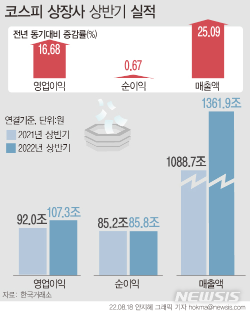 [서울=뉴시스] 올해 상반기(1~6월) 유가증권시장 상장사들의 연결 기준 매출액은 1361조 8708억원으로 전년 동기 대비 25.09%(273조 1821억원) 증가했다. 영업이익은 107조 3084억원으로 16.68%(15조 3430억원) 늘었다.
