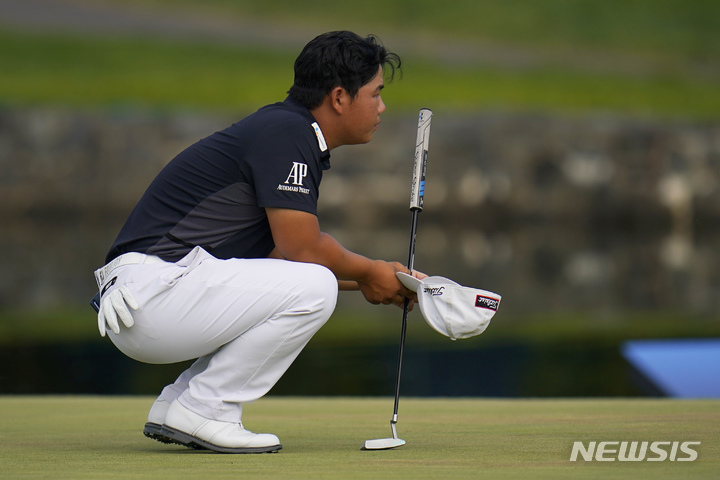 [윌밍턴=AP/뉴시스] 김주형이 19일(현지시간) 미 델라웨어주 윌밍턴의 윌밍턴 컨트리클럽에서 열린 미국프로골프(PGA) 투어 플레이오프(PO) 2차전 BMW 챔피언십 2라운드 12번 그린에서 다른 선수의 경기를 바라보고 있다. 김주형은 중간 합계 이븐파 142타 공동 48위를 기록했다. 2022.08.20.