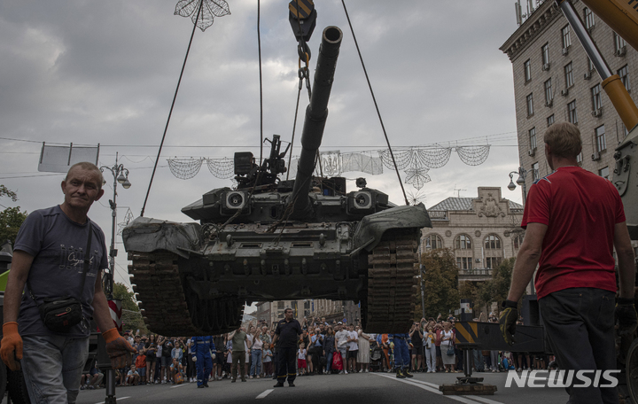 [키이우=AP/뉴시스] 20일(현지시간) 우크라이나 키이우 시민들이 거리에 전리품으로 전시된 러시아 군용 차량을 구경하고 있다. 키이우 시내에서 파괴된 러시아군의 전차와 병력 수송 차량 등이 전시돼 많은 시민과 아마추어 사진가들의 관심을 끌었다. 2022.08.21.