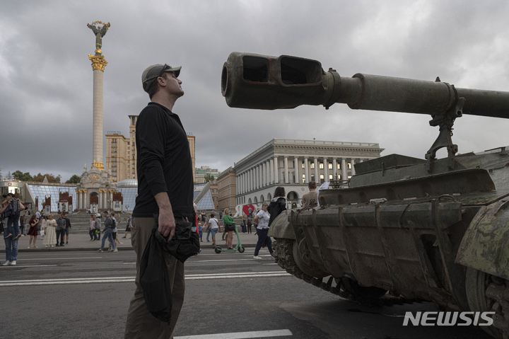 [키이우=AP/뉴시스] 20일(현지시간) 우크라이나 키이우 시민들이 거리에 전리품으로 전시된 러시아 군용 차량을 구경하고 있다. 키이우 시내에서 파괴된 러시아군의 전차와 병력 수송 차량 등이 전시돼 많은 시민과 아마추어 사진가들의 관심을 끌었다. 2022.08.21.