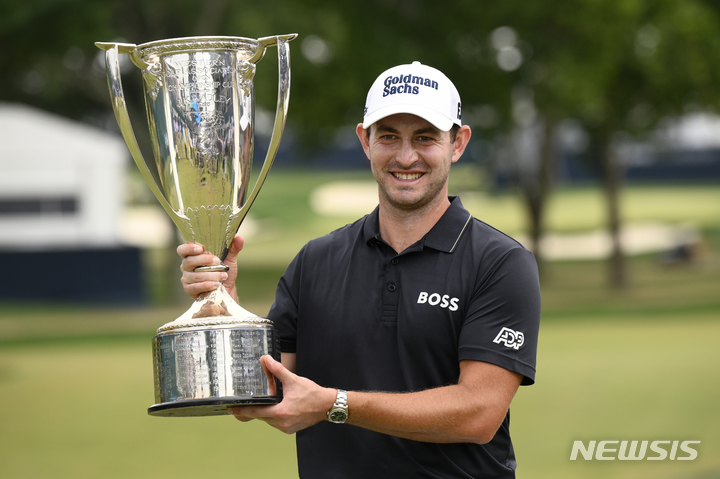 [윌밍턴=AP/뉴시스] 패트릭 캔틀레이(미국)가 21일(현지시간) 미 델라웨어주 윌밍턴의 윌밍턴 컨트리클럽에서 열린 미국프로골프(PGA) 투어 플레이오프(PO) 2차전 BMW 챔피언십 정상에 올라 트로피를 들고 포즈를 취하고 있다. 캔틀레이는 최종 합계 14언더파 270타로 우승하며 이 대회 2연패를 기록했다. 2022.08.22.