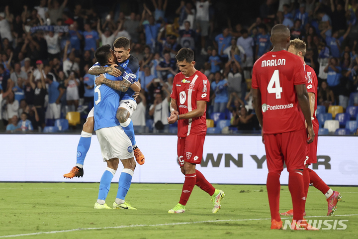[나폴리=AP/뉴시스] SSC 나폴리의 김민재(왼쪽)가 21일(현지시간) 이탈리아 나폴리의 스타디오 아르만도 마라도나에서 열린 2022-23 세리에A 2라운드 몬차와의 경기 후반 추가시간 팀의 4번째 골을 넣고 동료와 기뻐하고 있다. 김민재는 세리에A 2경기 만에 데뷔골을 넣었고 나폴리는 4-0으로 승리했다. 2022.08.22.