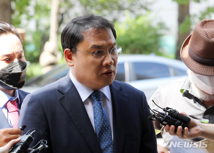 [서울=뉴시스] 배훈식 기자 = 강신업 변호사가 23일 오후 서울 마포구 서울경찰청 반부패공공범죄수사대 앞에서 이준석 국민의힘 전 대표 명예훼손 혐의 고소 취지를 밝히고 있다. 2022.08.23. [email protected]
