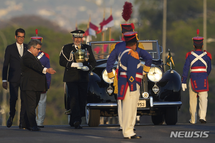 [브라질리아=AP/뉴시스] 23일(현지시간) 브라질 수도 브라질리아의 대통령궁에서 포르투갈 군 관계자가 의장대의 영접을 받으며 브라질 초대 황제 동 페드루 1세의 심장이 담긴 함을 옮기고 있다. 포르투갈의 한 성당에 방부 처리돼 안치됐던 이 심장은 브라질의 독립 200주년 기념(9월7일)행사가 끝나면 다시 포르투갈로 돌아간다. 2022.08.24.
