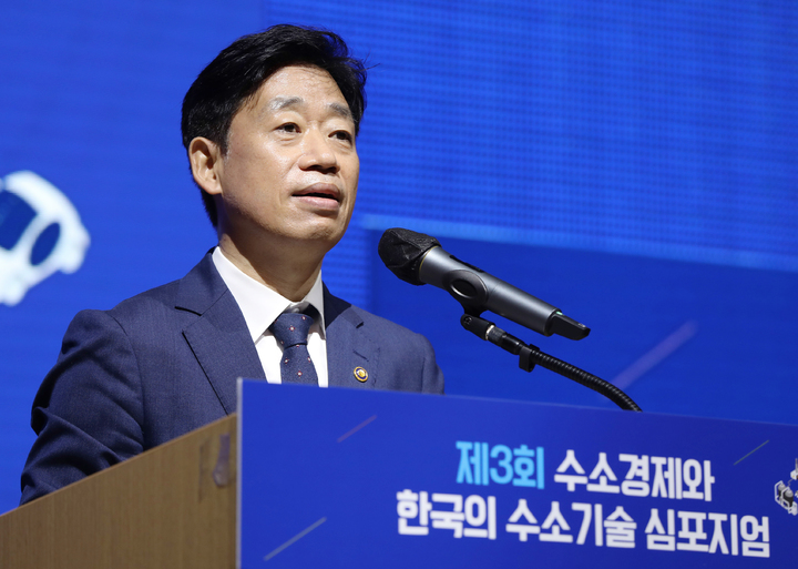 [서울=뉴시스] 오태석 과학기술정보통신부 제1차관이 25일 대전 유성구 대전컨벤션센터(DCC)에서 열린 '제3회 수소경제와 한국의 수소기술 심포지엄'에 참석해 축사를 하고 있다. (사진=과학기술정보통신부 제공) 2022.08.25. [email protected] *재판매 및 DB 금지