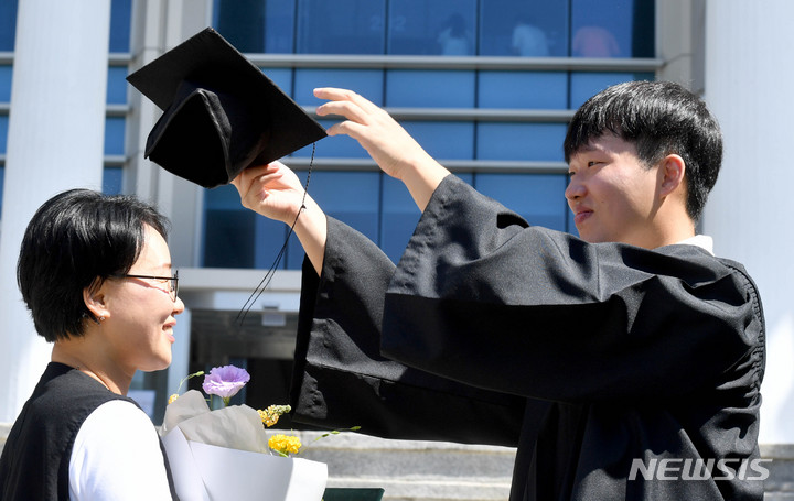 [광주=뉴시스] 변재훈 기자 = 코로나19 이후 첫 대면 학위수여식이 열린 26일 오전 광주 북구 전남대학교에서 한 졸업생이 어머니에게 학사모를 씌워주고 있다. 2022.08.26. [email protected]