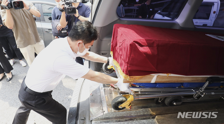[수원=뉴시스] 김종택 기자 = 생활고와 투병 끝에 세상을 등진 '수원 세 모녀'의 발인이 26일 경기 수원시 권선구 중앙병원 장례식장에서 엄수된 가운데 고인의 관이 운구차에 실리고 있다. (공동취재사진) 2022.08.26. [email protected]