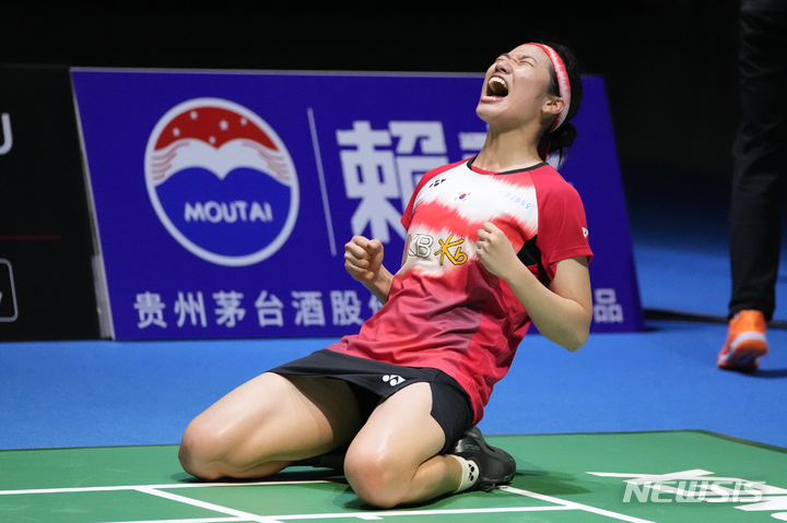 [도쿄=AP/뉴시스] 안세영(3위)이 26일 일본 도쿄의 메트로폴리탄 경기장에서 열린 2022 세계배드민턴연맹(BWF) 세계선수권대회 여자 단식 8강전 한위에(22위·중국)를 꺾고 환호하고 있다. 안세영은 세트 스코어 2-0(21-9 21-9)으로 물리치고 준결승에 올랐다. 2022.08.27.