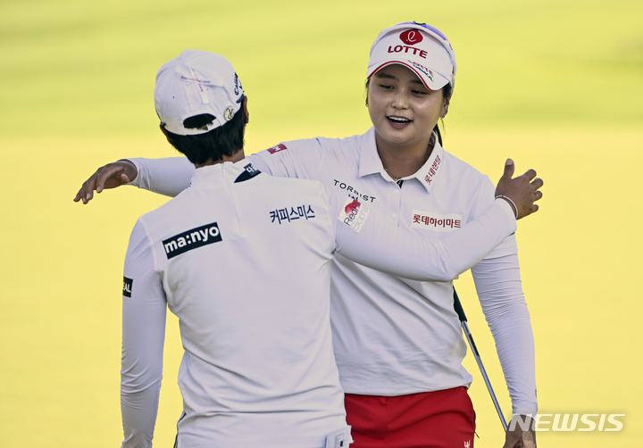 [오타와=AP/뉴시스] 최혜진(오른쪽)과 안나린이 27일(현지시간) 캐나다 오타와의 오타와헌트앤드골프클럽에서 열린 미국여자프로골프(LPGA)투어 CP 여자오픈 3라운드 18번 홀 경기를 마친 후 포옹하고 있다. 최혜진은 중간 합계 16언더파 197타로 안나린과 공동 선두에 올랐다. 2022.08.28.