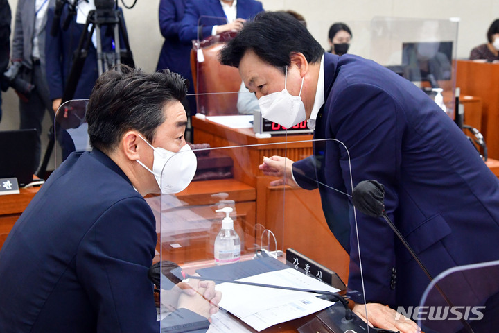 [서울=뉴시스] 김선웅 기자 = 국회 보건복지위원회 강기윤(오른쪽) 국민의힘 간사와 강훈식 더불어민주당 간사가 30일 서울 여의도 국회에서 열린 보건복지위원회 전체회의에서 대화를 하고 있다. (공동취재사진) 2022.08.30. [email protected]