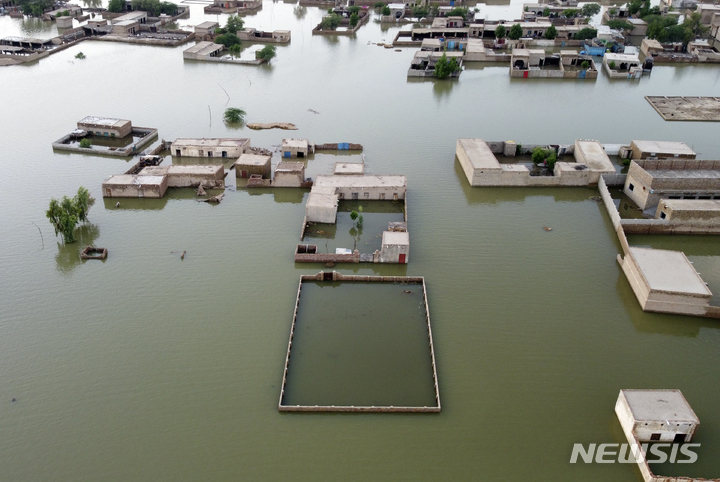 [자파라바드=AP/뉴시스] 1일(현지시간) 파키스탄 발루치스탄주 자파라바드에서 가옥들이 홍수로 불어난 물에 둘러싸여 있다. 파키스탄 보건 당국은 최근 기록적인 홍수가 발생한 지역에서 수인성 전염병이 발생했다고 밝혀 확산이 우려되고 있다. 2022.09.02.