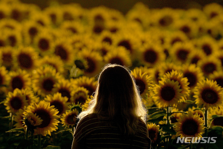 [로렌스=AP/뉴시스] 1일(현지시간) 미 캔자스주 로렌스 인근 그린터 농장에서 한 방문객이 해바라기를 바라보고 있다. 그린터 가족이 매년 해바라기를 심는 이 밭은 늦여름에 꽃을 피우는 일주일 동안 수천 명의 방문객을 끌어모은다. 2022.09.02.