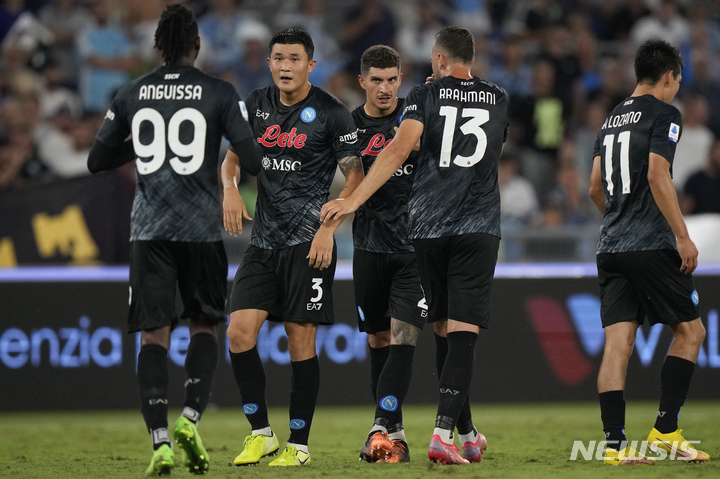 [로마=AP/뉴시스] 나폴리 수비수 김민재(왼쪽 두 번째)가 3일(현지시간) 이탈리아 로마의 스타디오 올림피코에서 열린 2022~23 이탈리아 프로축구 세리에A 5라운드 라치오와의 경기 전반 38분 동점 골을 넣고 동료들과 기뻐하고 있다. 김민재의 동점 골에 힘입어 나폴리는 2-1로 역전승했다. 2022.09.04.
