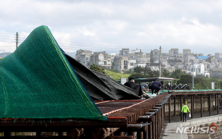 [서귀포=뉴시스] 우장호 기자 = 제11호 태풍 '힌남노(HINNAMNOR)'가 북상 중인 4일 오전 제주 서귀포시 예래동 논짓물에서 마을 청년 관계자들이 태풍 피해를 막기 위해 시설 정비를 하고 있다. 기상청에 따르면 태풍은 오는 6일 새벽 제주를 지나 남해안에 상륙할 것으로 전망됐다. 2022.09.04. [email protected]