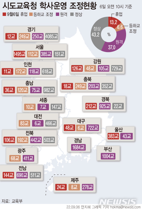 [서울=뉴시스] 제11호 태풍 '힌남노' 여파로 6일 오전 10시 기준 전국 유치원과 초·중·고교 절반 가량이 등교를 하지 못한 것으로 조사됐다. 전국에서 7348개교(37.0%)가 원격수업을 운영, 2615개교(13.2%)가 휴업했다. 또 1317개교(6.6%)가 등교나 하교 시간을 조정했다. (그래픽=안지혜 기자)