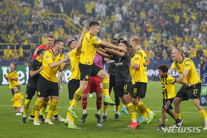 [도르트문트=AP/뉴시스] 보루시아 도르트문트 선수들이 6일(현지시간) 독일 도르트문트의 지그날 이두나 파크에서 열린 2022-23 유럽축구연맹(UEFA) 챔피언스리그 G조 1차전에서 FC 코펜하겐(덴마크)을 3-0으로 물리친 후 환호하고 있다. 2022.09.07.