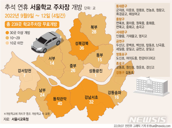[서울=뉴시스] 7일 서울시교육청에 따르면 추석 연휴를 맞아 오는 9일부터 12일까지 4일간 239개교가 학교 내 운동장 및 주차장을 무료 개방한다. (그래픽=전진우 기자)