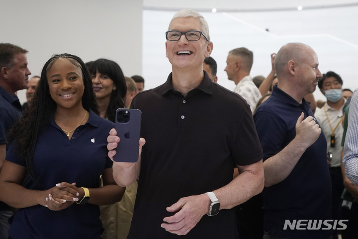 [쿠퍼티노=AP/뉴시스] 팀 쿡 애플 최고경영자가 7일(현지시간) 미 캘리포니아주 쿠퍼티노 애플파크에서 열린 신제품 공개 행사에 참석해 아이폰14를 들고 있다. 애플은 이날 애플워치 시리즈, 에어팟 등을 함께 공개했다. 2022.09.08.